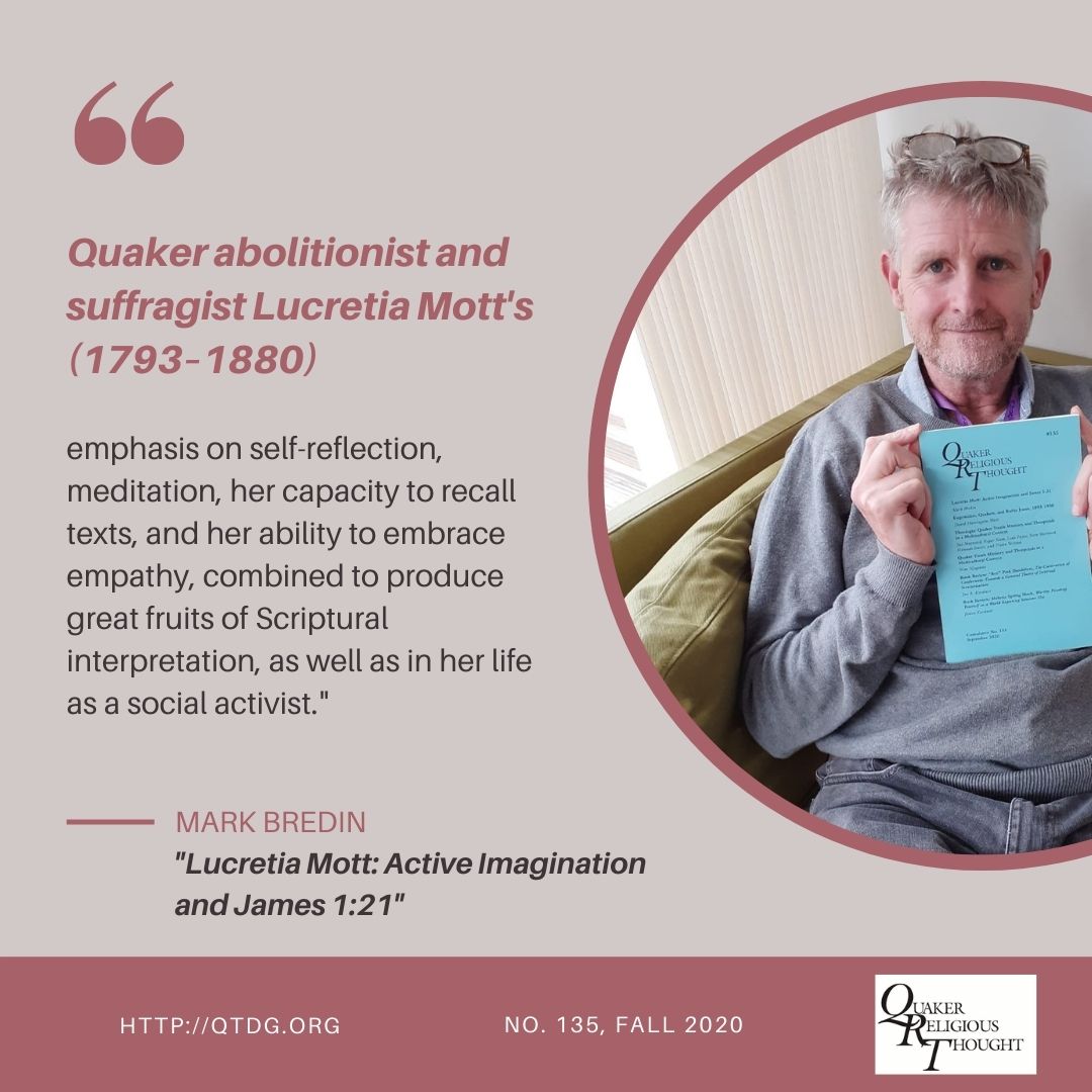 [Image description: Mark Bredin holds QRT #135, seated on a green couch. Pull quote: “Quaker abolitionist and suffragist Lucretia Mott’s (1793–1880) emphasis on self-reflection, meditation, her capacity to recall texts, and her ability to embrace empathy, combined to produce great fruits of Scriptural interpretation, as well as her life as a social activist.” —Mark Bredin, “Lucretia Mott: Active Imagination and James 1:21”)